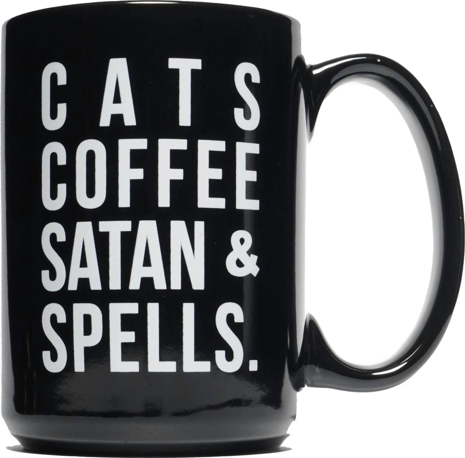 This mug has a very accurate list of all you need! Cats, Coffee, Satan and Spells…
