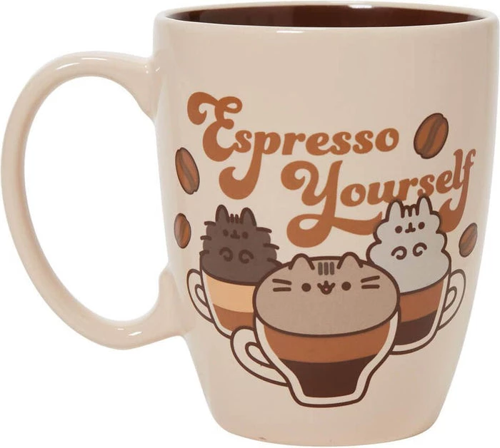 Express your love for coffee in with this adorable Pusheen themed mug. Caption reads ‘Expresso Yourself’ with cute illustrations of Pusheen, Stormy and Pip sitting in cups of coffee.