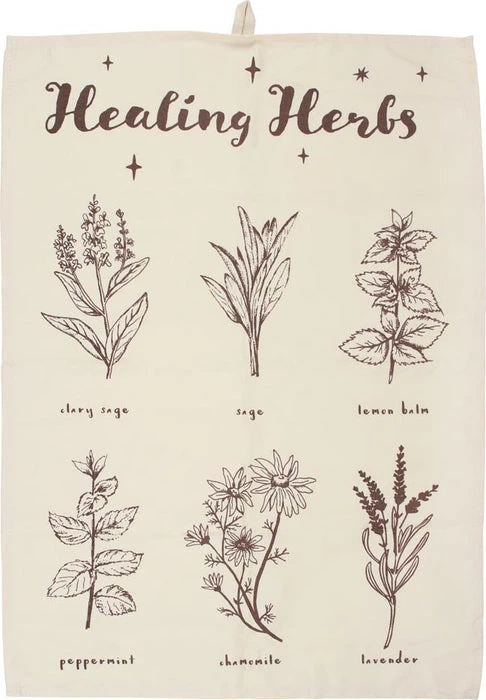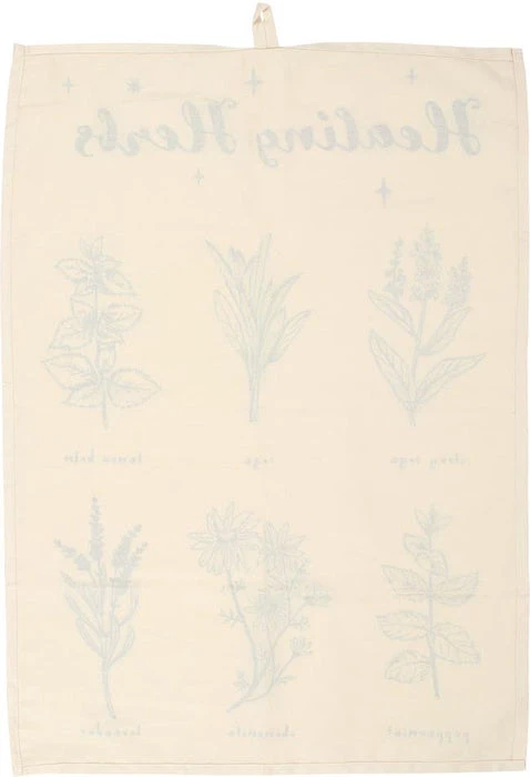 Memorise healing herbs with this tea towel featuring beautiful illustrations of herbs commonly used for their healing properties. Designed in neutral shades to compliment any kitchen.ย