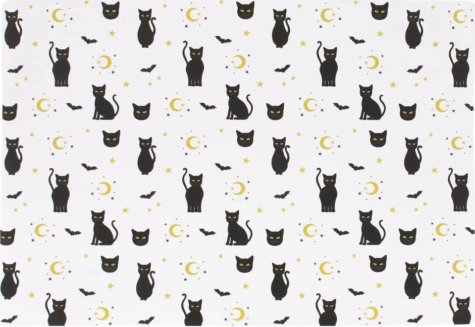 Protect surfaces from spills with this reusable plastic mat. With a mystical black cat, bat and moon design and a wipeable surface, this mat is great for keeping under pet food bowls at dinner time. Also makes a great placemat at a gothic table!Β