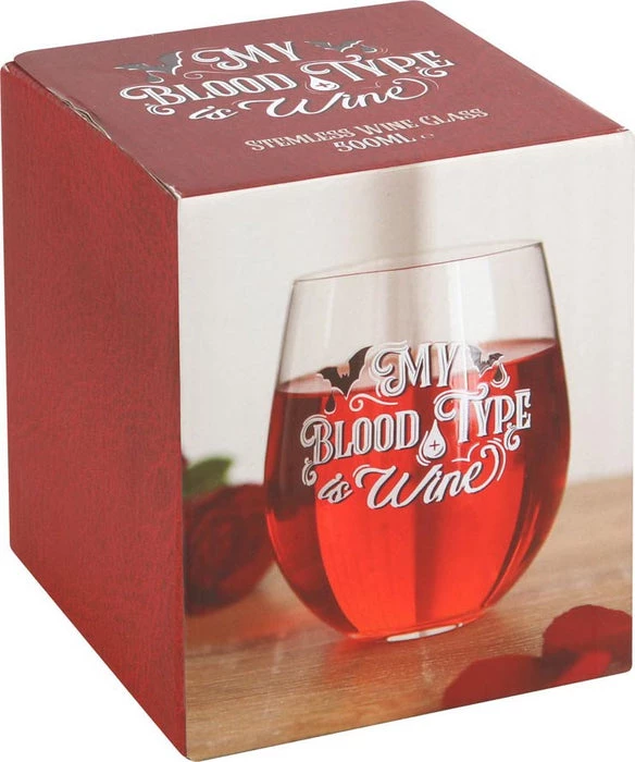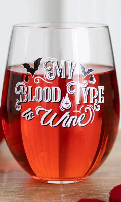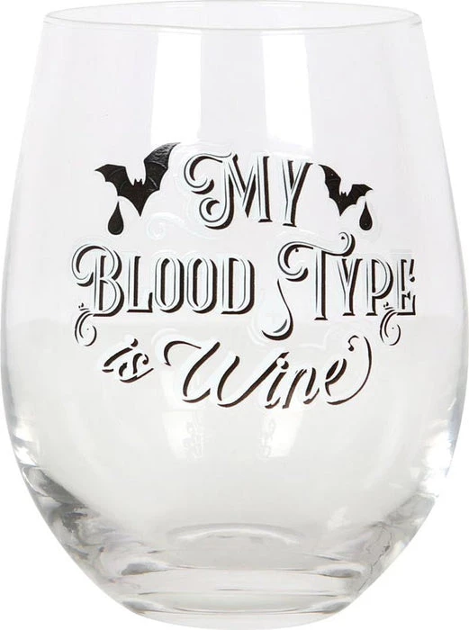 This stemless wine glass features ‘My Blood Type is Wine’ text with gothic bat designs. Perfect for sipping red wine after a long night of mischief.