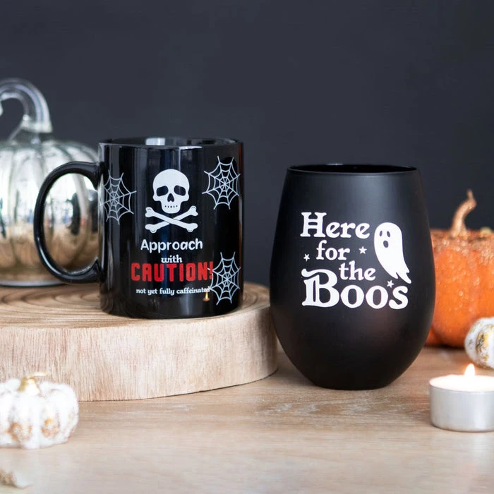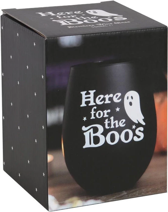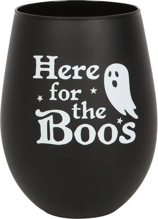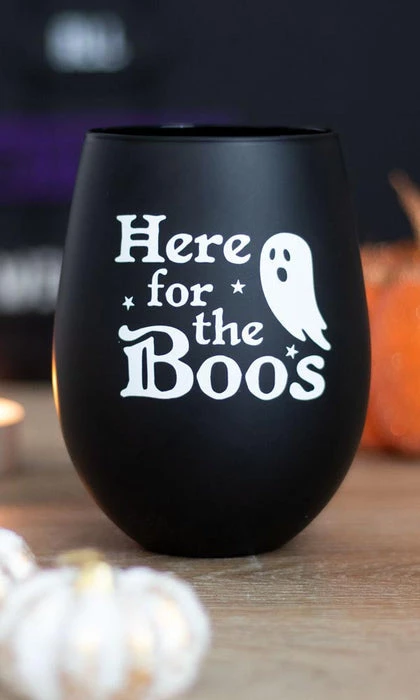 Add your magical cocktail concoctions to this spooky stemless glass featuring the cheeky text ‘Here for the Boos’.
