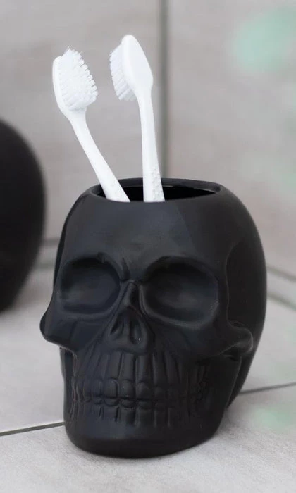 This black skull toothbrush holder is a unique piece to finish off a gothic sink space. Also perfect for holding pens, makeup brushes and more.ย