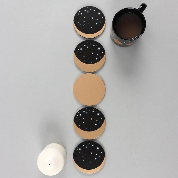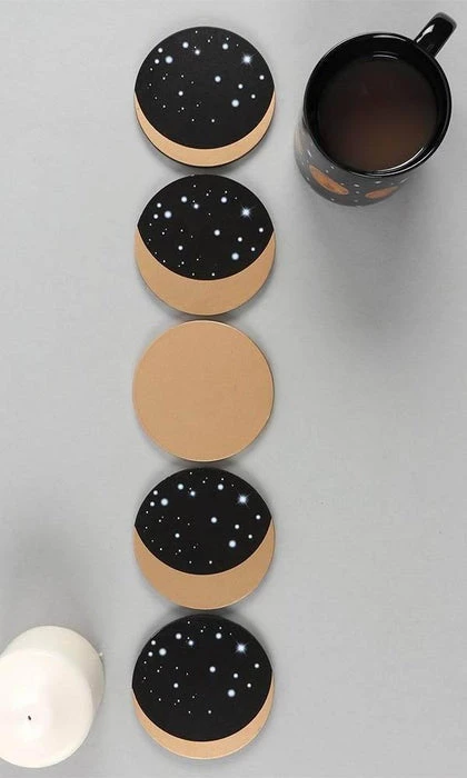 This set of 5 coasters represent the moon phases when aligned. Made in contrasting colours of natural wood painted with black to represent the night sky, dotted with stars.