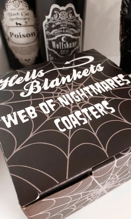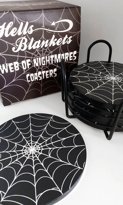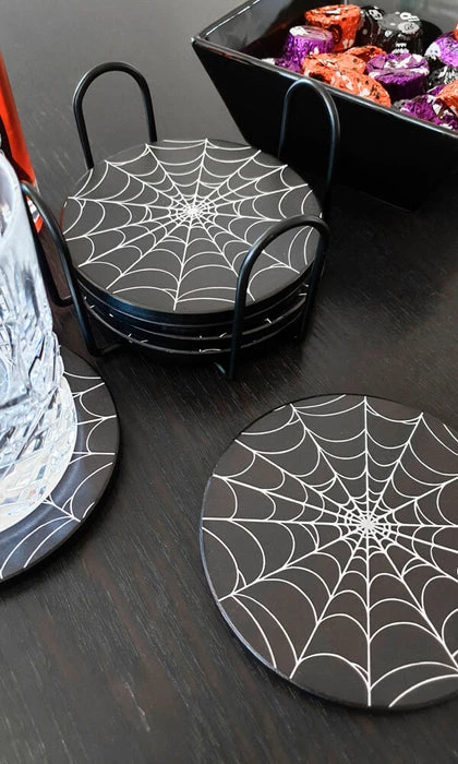 Add a spooky touch to your next dining experience with these hauntingly beautiful webbed coasters! Each set comes with a black coaster holder and matching black box, perfect for gifting!