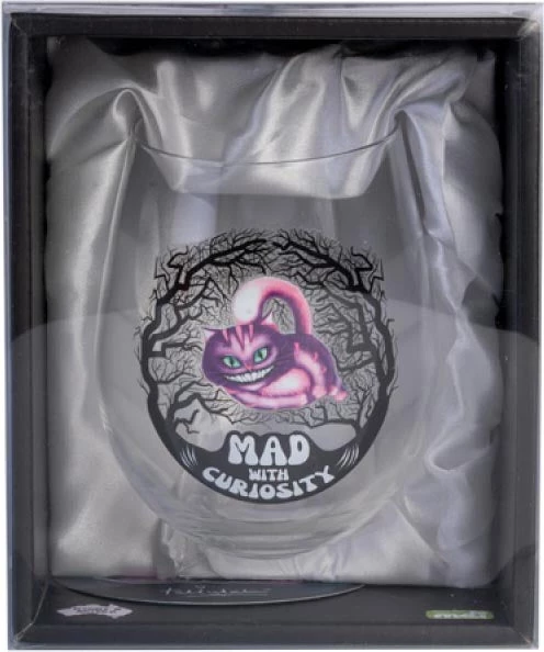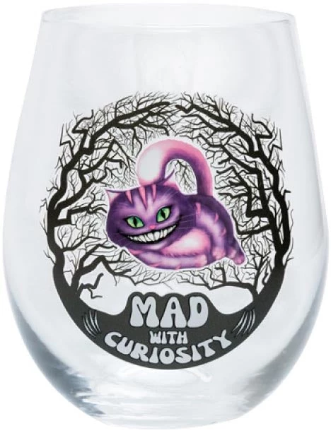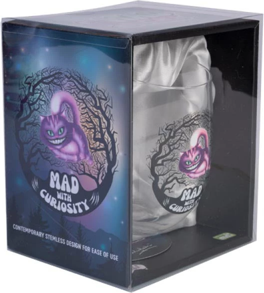 Hand-blown stemless glass featuring mystical forest scenery and a curled up mad cat. Bubble letters read ‘Mad With Curiosity’.ย