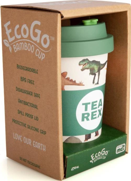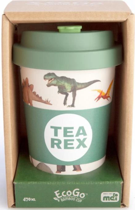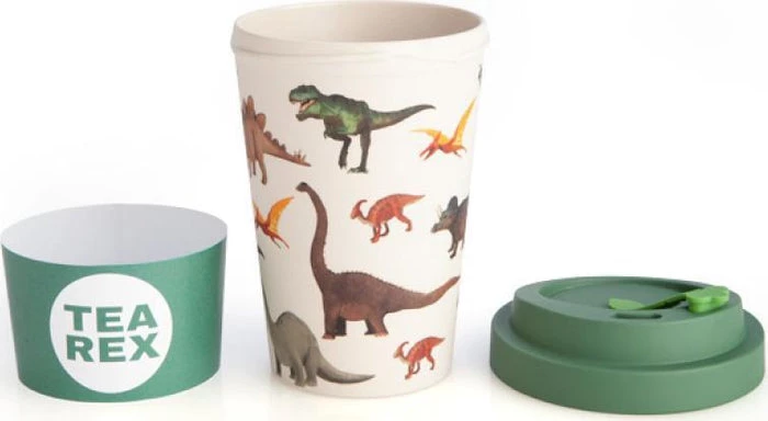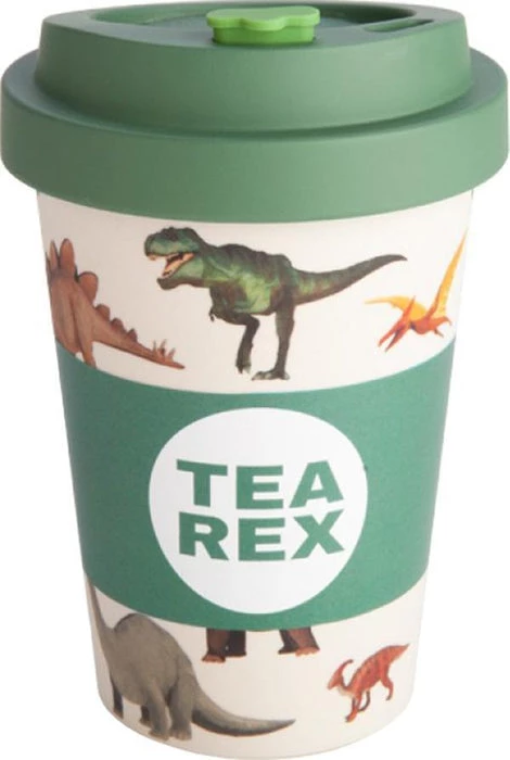 This eco-friendly travel cup made from bamboo features a pattern of all kinds dinosaurs. Matching dark green anti-spill lid and protective silicone band with ‘Tea Rex’ decal.