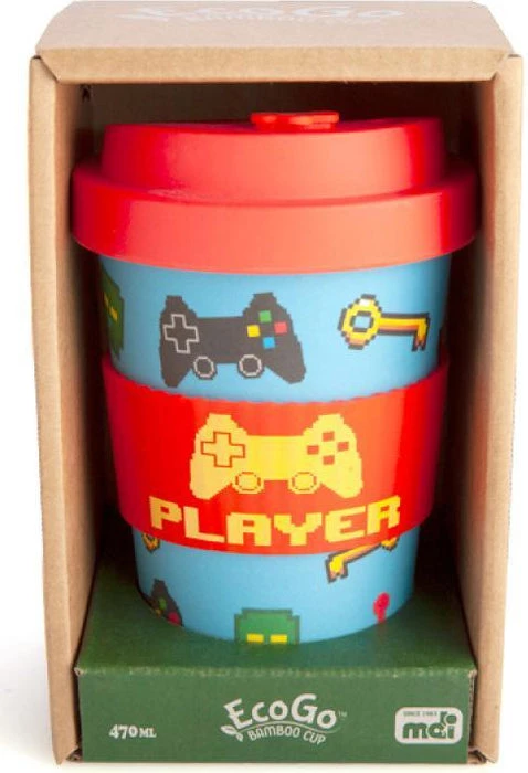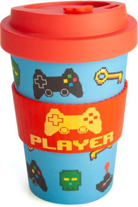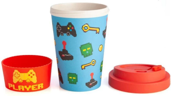 Gamers need more than just Mountain Dew. They need coffee too! Especially if you are a speed-runner! This eco-friendly travel cup made from bamboo means you can take your hot beverage of choice anywhere you want to show off your console skills. Features a pattern of pixel art-style gaming icons on a blue background. Matching red anti-spill lid and protective silicone band with pixel art ‘Player’ decal.