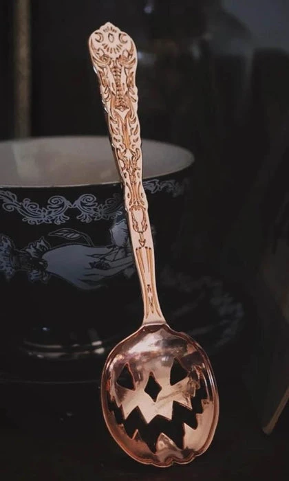Haunted Hallows. The official Jack-O-Lantern of Lively Ghosts. This 6″ spoon features intricate design-work on the handle — including crescent moons and a Victorian-inspired filigree — as well as a cutout jack-o-lantern design for the base. Perfect for mixing libations such as tea, cocktails, poison, and the like.