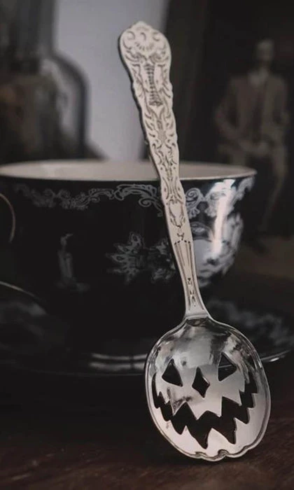 Haunted Hallows. The official Jack-O-Lantern of Lively Ghosts.ย This 6″ spoon features intricate design-work on the handle โ including crescent moons and a Victorian-inspired filigreeย โ as well as a cutout jack-o-lantern design for the base. Perfect for mixing libations such as tea, cocktails, poison, and the like.ย