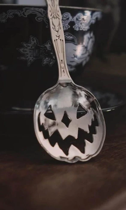 Style:ย Tea Spoon, featuring cutouts for at the base for the jack-o-lantern eyes, nose, and mouth.