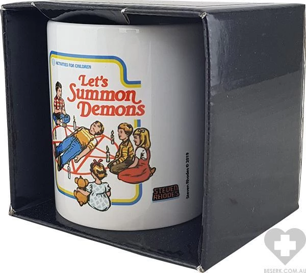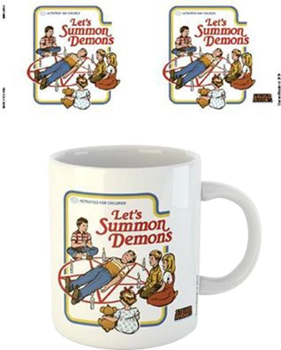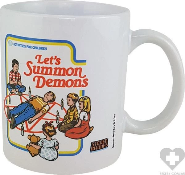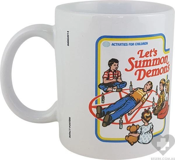 Ceramic mug with print featuring children attempting to summon demons with a summoning circle.Β