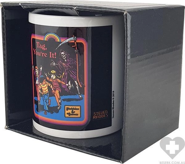 Ceramic mug with print featuring children being chased by Death, while having a game of tag… Or is it just a game?